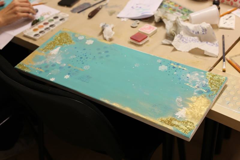Last weekend I was in Budapest on a Mixed Media Workshop organized by NőiCsizma Design. The full-day workshop was spiced with a bit of calligraphy. The Fanatic Calligrapher taught Brush Script, (how to write with ink and brush). I really like the technique and the result but for nice result you need many-many hours of practice. On the WS I created a 60x25 cm Christmas-themed canvas.