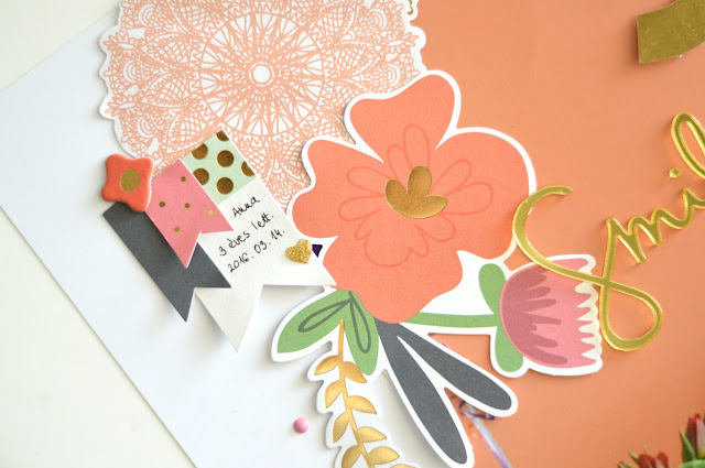 I thought the bottom of the layout looked busy enough already so I used decorative elements only at the top of the layout. I added lots of pieces from the ephemera pack. Their size is quite big so they look great on this layout. The stars of the layout (after the family) are the two big die cut flower bouquets. They’re gorgeous! I also added ephemera doilies to the top of the layout to cover the balloons as their colours didn’t fit with My Mind’s Eye On Trend 2.
